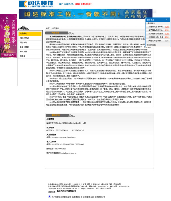北京闊達構筑裝飾工程有限責任公司創建于1997年,是“構筑裝飾施工二級資質”單元、中國構筑裝飾協會常務理事單元、北京市構筑裝飾協會副會長單元、天下工商聯家具裝飾業協會副會長單元。公司顛末12年的生長強盛,已成為北京從事構筑裝飾專業操持與施工企業中的領軍企業。