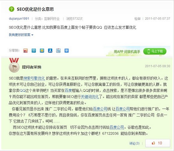 4. 看到這些我們想的不是說百度是不是不公平,是不是只許州官放火,不許百姓點燈的情況,大家要是這樣想就錯了!大家看看為什么百度知道會這樣調整!意義在那里?我們可以借鑒什么?為什么我們做seo做搜索引擎優化,不在搜索引擎中去了解他的東西 他的變化 他的發展,以及他的創新和改變,孫子兵法沒有教我們 知己知彼嗎?多的不說了!說多了不招人待見!有其他見解可以私下找我!一起探討!